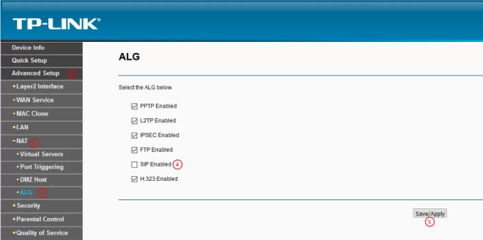 - Στο μενού του ALG, Απενεργοποιήστε την επιλογή SIP Enabled.