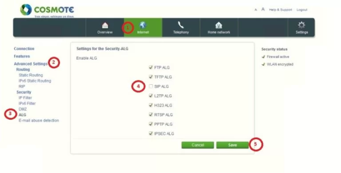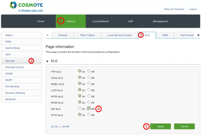 Για να απενεργοποιήσετε το SIP ALG στο router της Cosmote, ακολουθήστε τη διαδικασία όπως εμφανίζεται στην παρακάτω εικόνα.